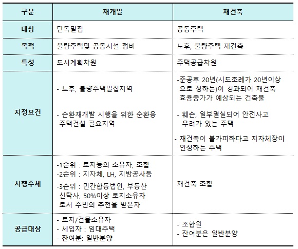 정비기반시설은 양호하나 노후 불량건축물에 해당하는 공동주택이 밀집된 지역에서 주거환경을 개선하기 위한 사업을 뜻합니다. 주로 도심에 위치한 5층짜리 아파트가 땅 지분이 많기때문에 사업성이 높아 먼저 재건축이 됩니다.