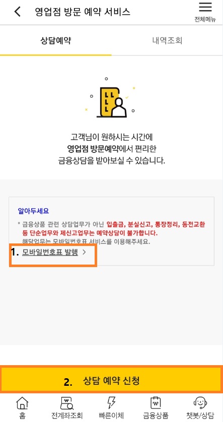 은행 대기 시간을 절약할 수 있는 방법 중 하나가 모바일번호표로 방문예약을 하고 가는 것입니다. 핸드폰에 KB스타뱅크 어플을 깔고 방문해보세요.