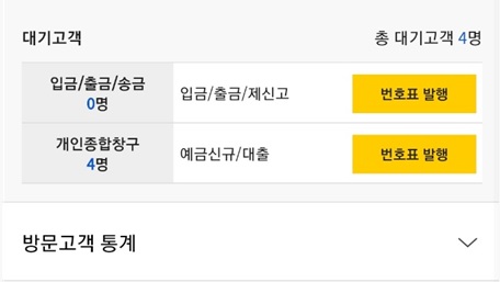 은행 도착 전 대기고객 수 3명 확인했는데 도착하니 대기수 4명으로 큰 차이가 없었습니다. 저는 제신고 때문에 방문했는데 대기시간 10분 만에 업무를 해결했습니다. 번호표 없이 방문해서 1시간 정도 기다려 본 적도 있었습니다.