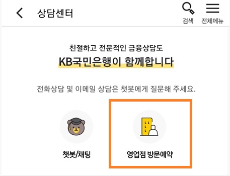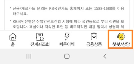"KB스타뱅킹' 어플을 실행 로그인 후 오른쪽 아래 있는 챗봇/상담을 누릅니다.