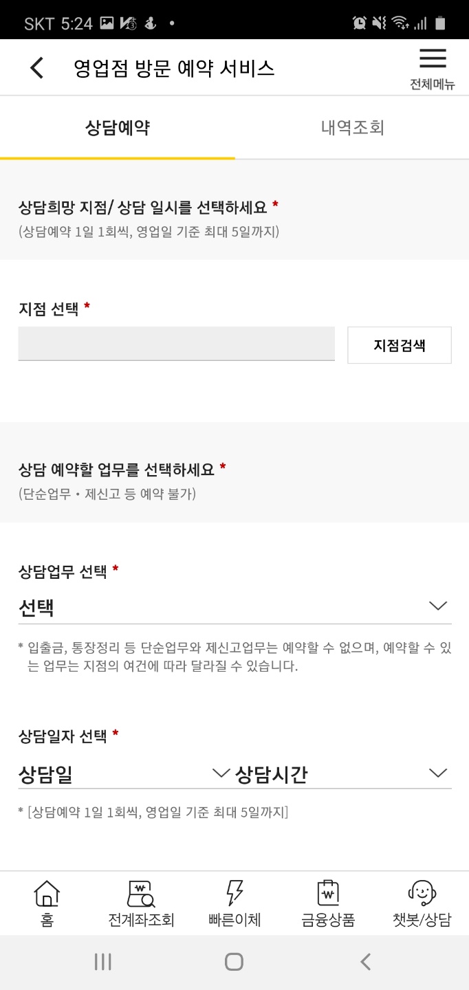간단한 업무가 아닌 경우 2번을 선택해 상담일, 상담시간을 예약을 하고 방문하는 것을 추천합니다. 방문예약은 오늘 기준으로 최대 5일까지 선택 가능합니다. 예약이 완료되면 예약신청현황이 KB스타 알림으로 확인되고, KB스타 알림이 없는 경우 문자로도 발송됩니다.(SMS 수신동의를 한 사람에 한함)