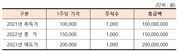 예를 들어 아래 표처럼 소액주주가 2021년 주당 10만 원의 주식 1천 주를 매수하여 2023년에 매도한다고 가정하겠습니다.