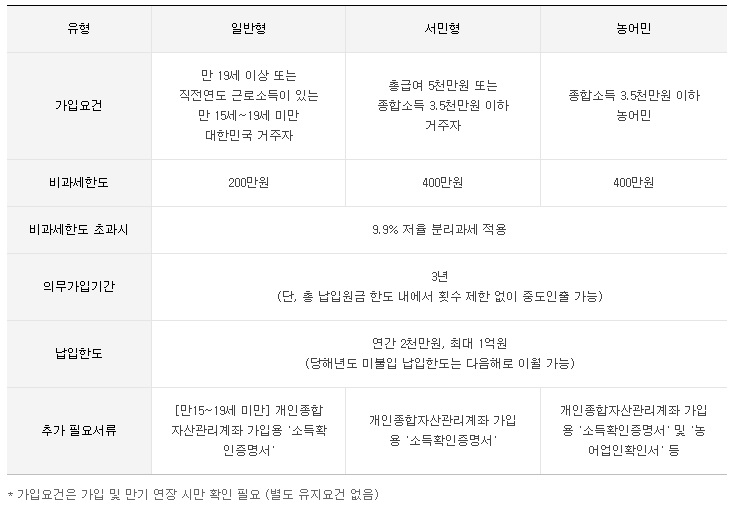 ▶의무가입기간은 기존 5년에서 3년으로 완화되었습니다. 또 납입한도는 연간 2,000만 원으로 동일하지만 한도를 다 못 채웠을 때 다음 해로 이월이 가능해졌습니다. 납인 최대한도는 1억 원입니다.