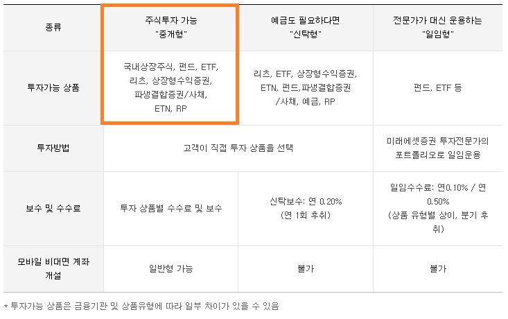 ▶가장 중요한 것은 국내 주식에 투자가 가능하다는 것입니다. 국내 증시에 상장된 주식과 ETF만 가능합니다. 미국에 상장된 주식이나 ETF에는 투자할 수 없습니다. 하지만 국내에 상장되어 미국 지수를 추종하는 ETF는 투자 가능합니다. 예를 들면 TIGER 나스닥 100, KODEX미국 S&P500등입니다. 요즘 미국에 상장된 주식이나 ETF에 투자하는 분들이 많아 아쉬워하는 부분이기도 합니다.