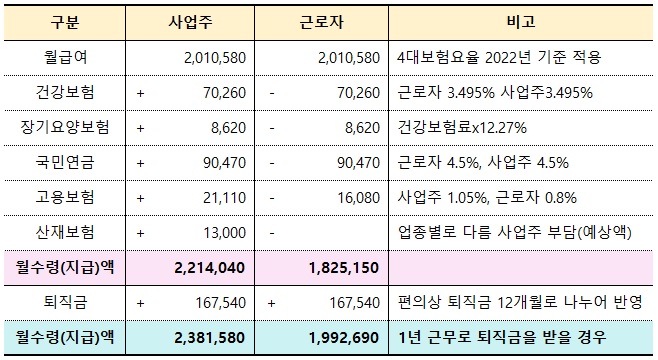 2023년도 최저임금은 2023.01.01~2023.12.31일까지 사업의 종류와 구분 없이 모든 사업장에 동일하게 적용됩니다. 건강보험이 해마다 상승하고 있어 내년도에도 소폭 인상될 것으로 예상됩니다. 위 표는 소득세와 지방소득세를 계산하지 않았기 때문에 실 수령액이 조금 더 줄어들 것으로 예상됩니다.