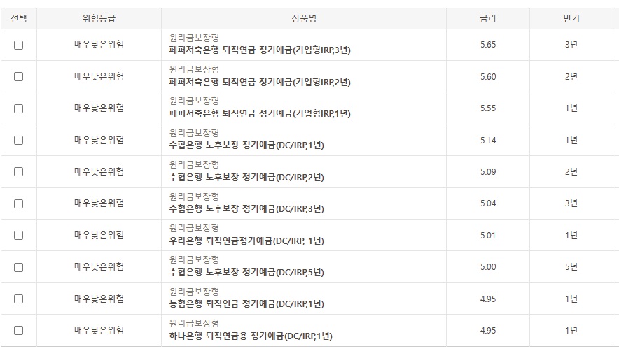 퇴직연금 DC 상품은 주기적으로 상품을 체크해 볼 필요가 있습니다. 처음 가입할 때 예금 상품으로 많이 선택하기 때문에 방치하게 되면 계속 같은 상품으로 운영될 확률이 높습니다. 정기 예금도 금융사마다 이자율이 조금씩 차이가 있고 1년, 3년, 5년짜리도 있습니다.