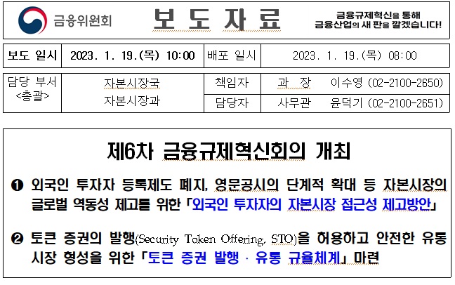 2023년 2월 5일 금융위원회는 토큰증권 발행(STO) 유통 규율체계 정비방안을 추진하겠다고 밝혔습니다. 국회, 금융위원회, 금융감독원, 증권사, 조각투자 기업등 STO 관련 기업 학계가 모여 논의를 시작한 것입니다.