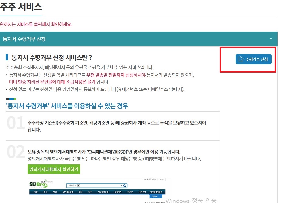 2. KSD증권대행을 눌러줍니다. 통지서 수령거부 신청