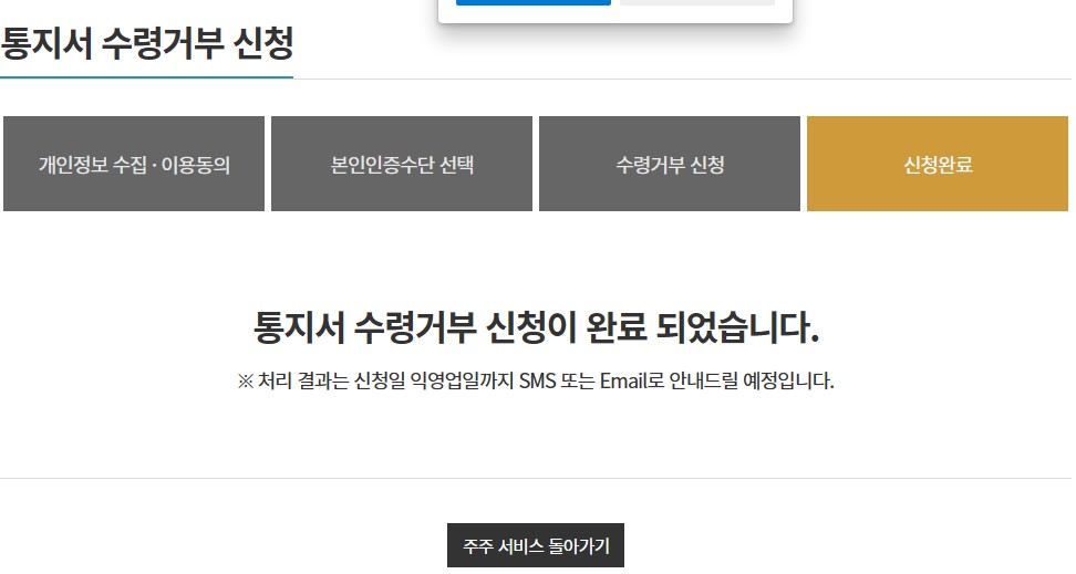 오전에 신청하니 오후 2시쯤 "통지서 거부 시청이 완료되었습니다."라는 문자가 왔습니다. 주식 우편물 거부 신청 복잡하지 않으니 미루지 말고 신청해 보세요. 요즘은 중간 배당 우편물도 오니 미루지 마세요.