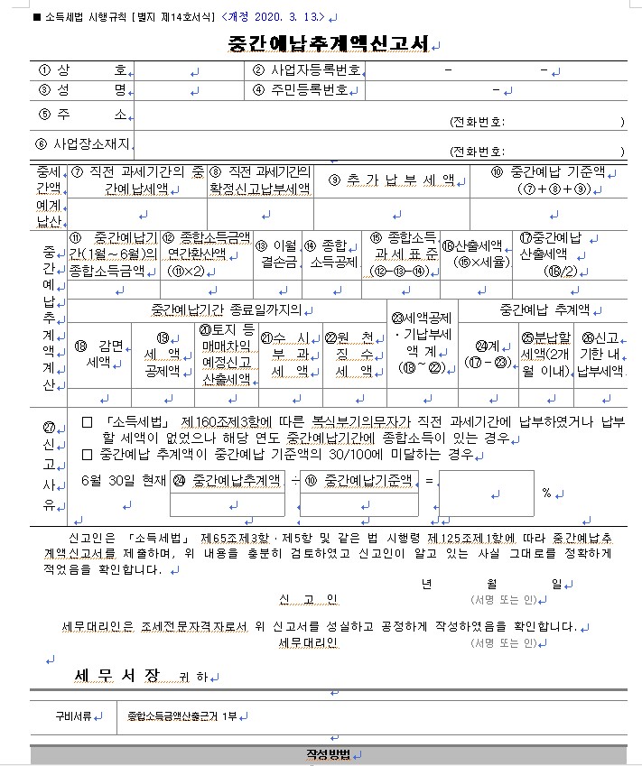 중간예납 추계액이 50만원 미만일 경우 납부할 필요는 없지만 중간예납 추계액 신고서는 반드시 제출해야 합니다. 중간예납세액이 1천만원이하인 경우 분납대상이 아닙니다.