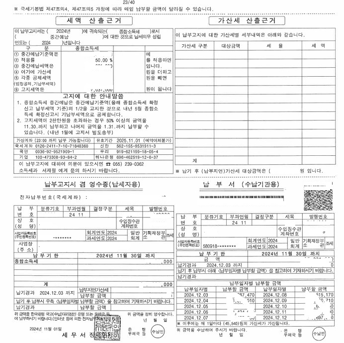 11월은 종합소득세 중간예납이 있는 달입니다. 5월에 종합소득세 신고를 하고 세금을 납부했다면 11월 초에 납부했던 금백의 절반을 중간예납으로 납부세액 고지서를 집으로 보내줍니다. 처음 고지서를 보면서 당황해하시는 분들도 있을 것 같습니다.